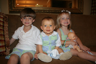 Parker is too big for smocked clothes, but I had these matching outfits and I could not resist. They look so cute!! This is the best I could get of them together. Don't they look trilled I can not believe how big they are. This is the one outfit they have where they all match!! I am trying to enjoy matching them while I can.